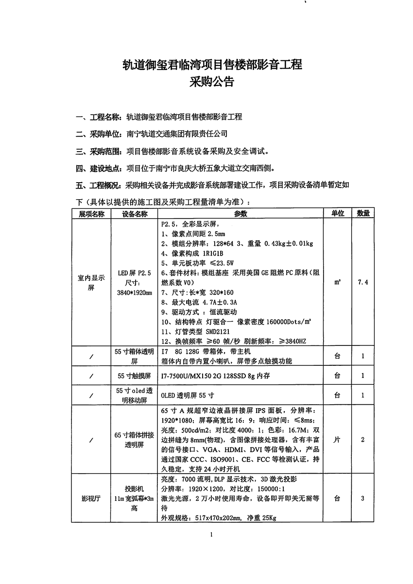 軌道御璽君臨灣項(xiàng)目售樓部影音工程采購(gòu)公告